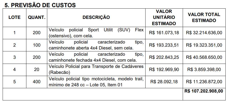 O termo de referência do edital traz cinco lotes, apontando demanda de até 920 veículos, incluindo 200 SUVs com cela, 100 caminhonetes sem cela e mais 200 com cela, 400 motocicletas e mais 20 veículos para transporte de cadáveres.