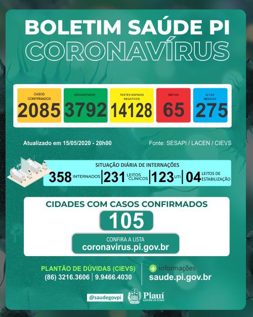 Nesta sexta-feira (15) o Piauí ultrapassou a marca de dois mil infectados com o Covid-19, são 2.085 casos, 180 a mais que ontem, e registrou mais cinco mortes, totalizando 65 mortos pelo novo coronavírus. Os dados foram divulgados pelo boletim epidemiológico da Secretaria de Estado da Saúde (Sesapi). Dos novos 180 infectados, 84 são homens e 96 mulheres com idades entre 9 e 91 anos.