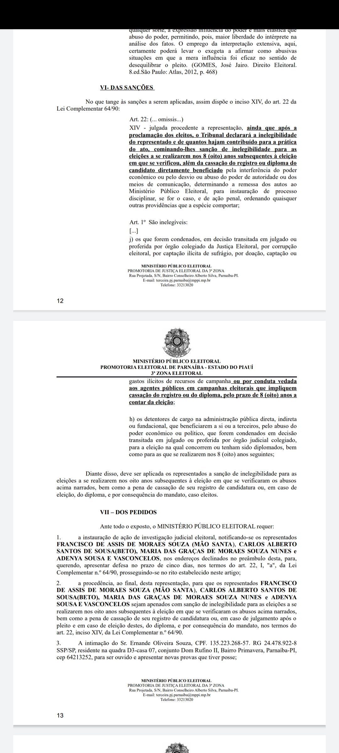 O Ministério Público Eleitoral (MPE), por meio do promotor Fernando Soares de Oliveira Júnior, da 3ª Zona Eleitoral de Parnaíba, ajuizou nesta quinta-feira (22) Ação de Investigação Judicial Eleitoral contra o prefeito Mão Santa e seu candidato a vice prefeito, Beto Sousa, respectivamente, por abuso de poder econômico.