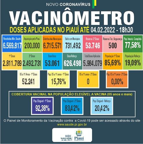Dos leitos existentes na rede de saúde do Piauí para atendimento à Covid-19, 482 estão ocupados,sendo 309 leitos clínicos, 152 UTI’s e 21 leitos de estabilização. As altas acumuladas somam 25.076 até o dia quatro de fevereiro de 2022.