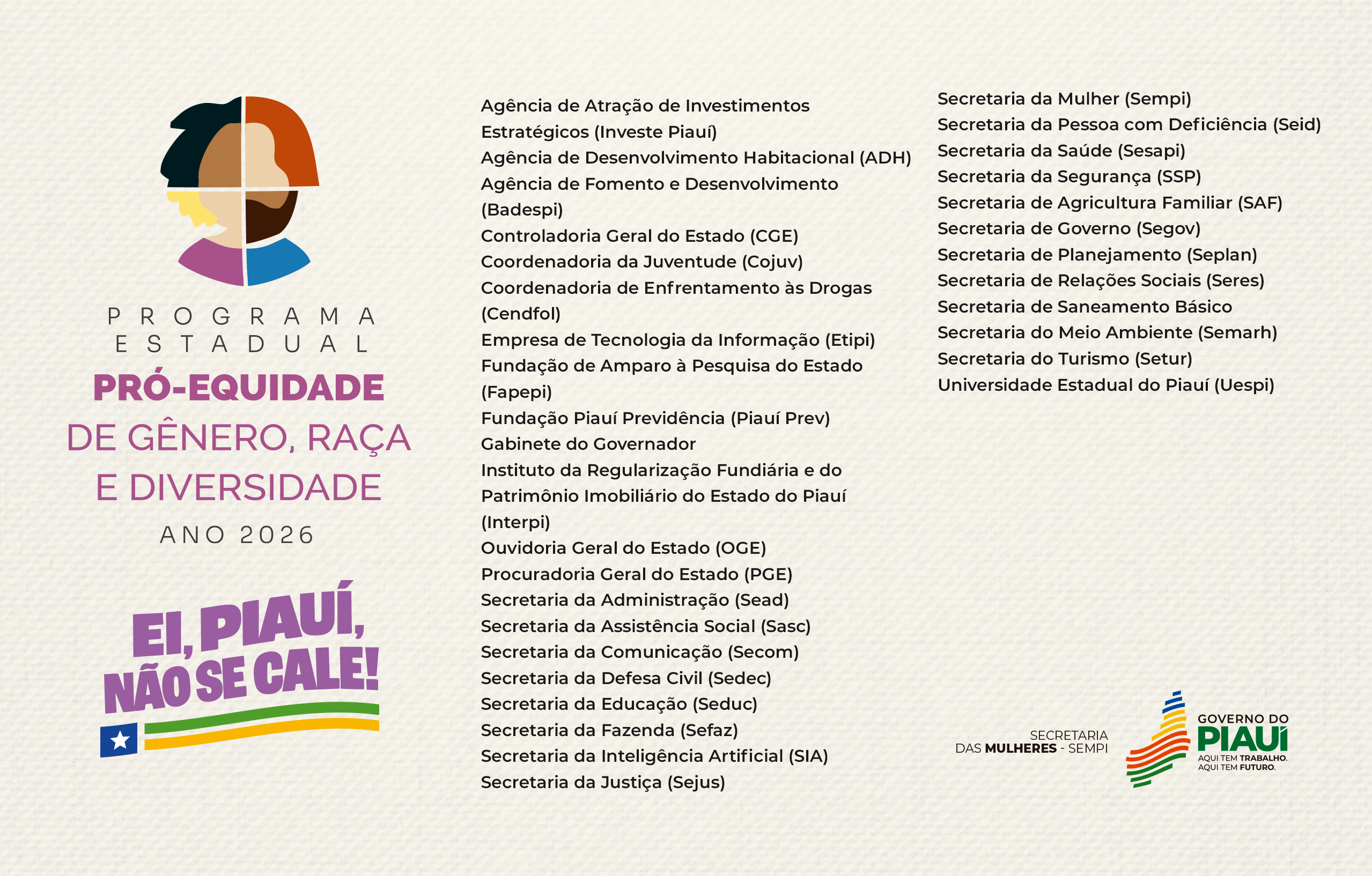 O Governo do Estado entregou, nesta segunda-feira (9), no Palácio de Karnak, em Teresina, o Selo Pró-Equidade de Gênero, Raça e Diversidade a 33 órgãos da administração estadual, em reconhecimento às ações voltadas à promoção da igualdade e da valorização da diversidade no serviço público. A entrega ocorreu durante o lançamento da campanha “Ei, Piauí, Não Se Cale”, que integra a programação do Março Mulher.